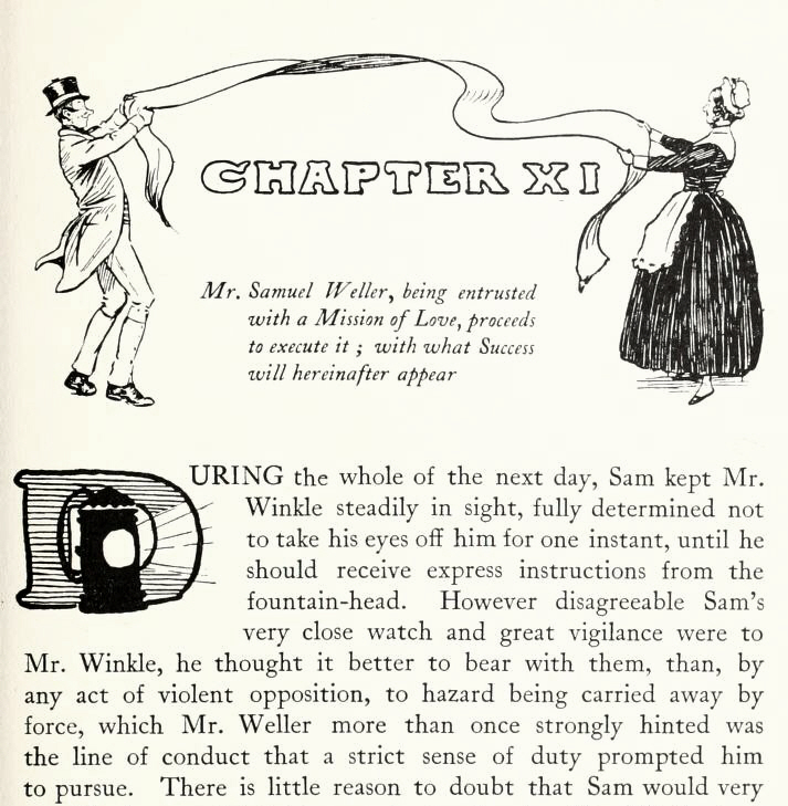 Während einer ganzen Woche nach der glücklichen Ankunft des alten Mr. Winkle von Birmingham waren Mr. Pickwick und Sam Weller tagsüber von zu Hause abwesend, kamen nur zum Essen zurück und trugen dann eine geheimnisvolle und wichtige Miene zur Schau, die ihren Naturen ganz fremd war.