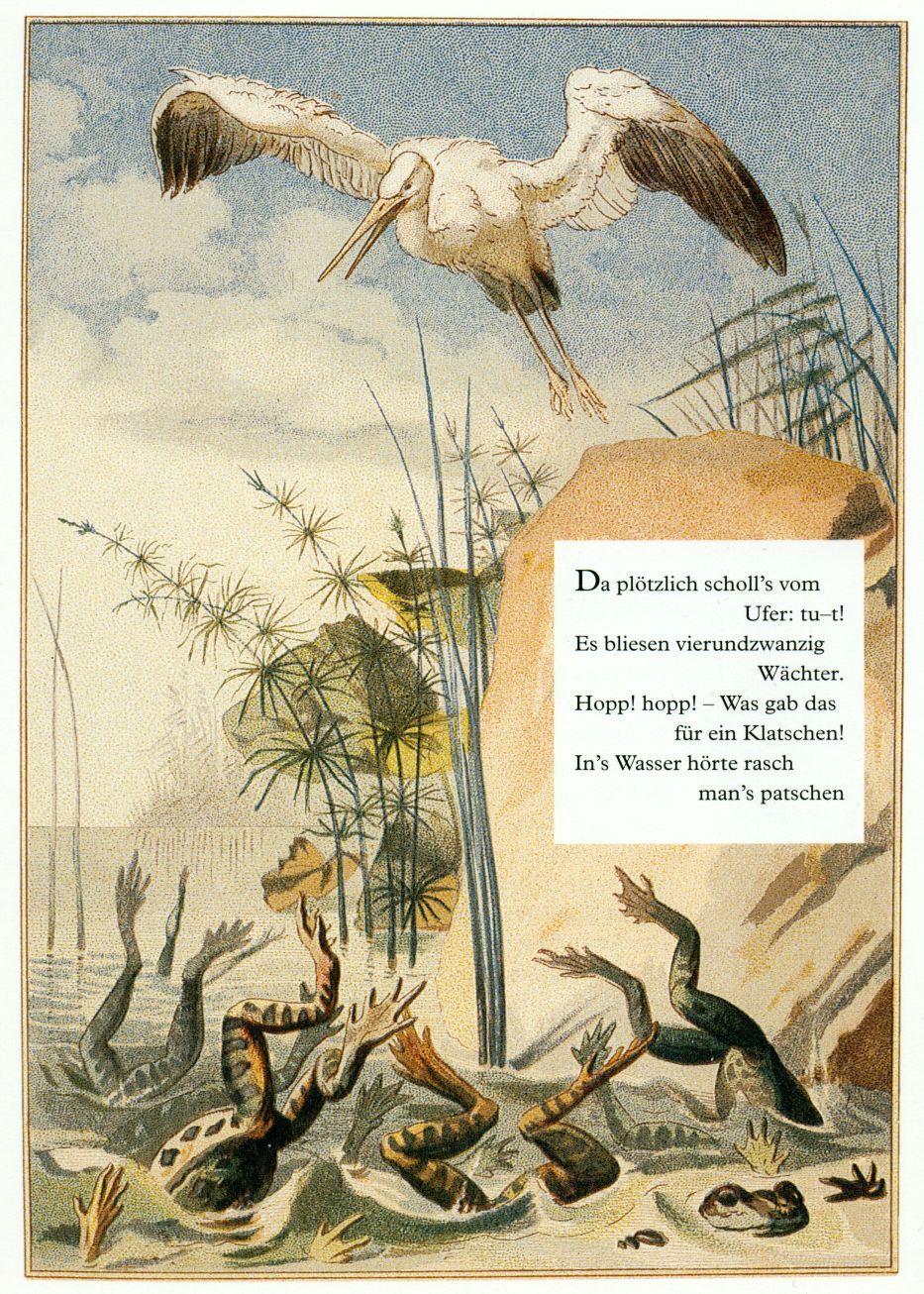 Vor geraumer Zeit zeigten wir Flinzers Illustrationen zu Reineke Fuchs. Nun folgen seine köstlichen Bilder zu Der Froschmäusekrieg. Die erste Ausgabe erschien im Jahre 1878.
