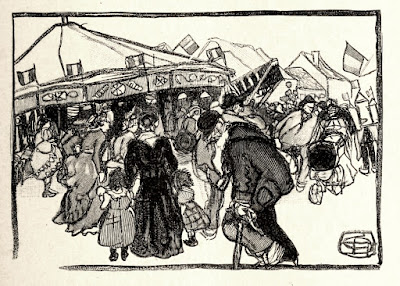 Les couples tournoyaient. Chaque fois qu'ils passaient dans le rais de soleil, une lueur jaune illuminait les visages, enveloppait les vestes et les robes qui ensuite s'obscurcissaient dans la pénombre. Des sourires, immobiles crevaient la face béate des filles. Les garçons, sérieux, les yeux baissés, semblaient 'se livrer à un devoir de profession. Quelques-uns, demi-gris, cramponnés à leurs danseuses et les entourant de toute la largeur de leurs bras, mettaient leur gloire à sauter très haut en frappant fortement leurs pieds à terre.